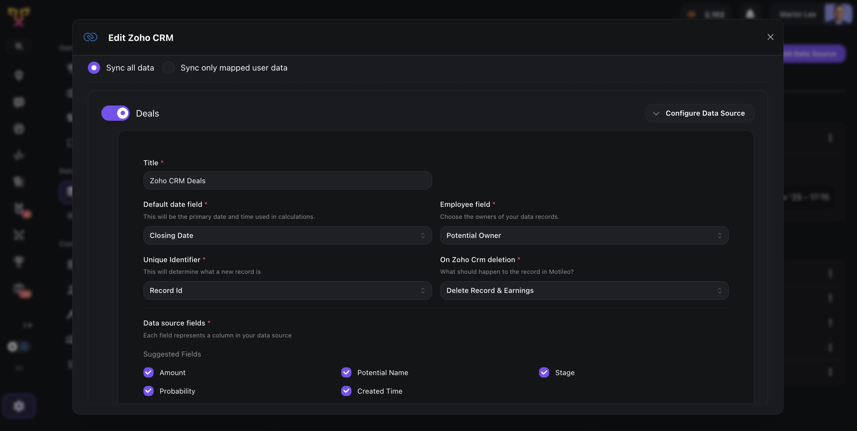 Connect Motileo with Zoho CRM within clicks. Data syncs in real time.